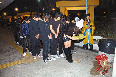 至吳遺體移送殮房時(shí),各人更脫下外套一字排開,組成“人肉屏障”阻擋記者鏡頭。至傍晚時(shí)分,該批青少年帶備香燭冥鏹,到介仔遇襲現(xiàn)場路祭,東九龍重案組及反黑組探員聞風(fēng)而至,逐一登記各人資料,并監(jiān)視路祭情況,眾青少年由一名儼如“大家姐”的少女率領(lǐng),拜祭一番后離去。