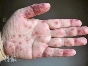 該聯(lián)合醫(yī)院35歲女護(hù)士,與家人居住九龍城區(qū),早前她兩名分別17個(gè)月大和4歲的女兒,疑被表兄弟傳染腸病毒,分別在5月5日和9日出現(xiàn)手足口病征狀,至5月12日,女護(hù)士亦被女兒傳染,手部出現(xiàn)紅疹。
