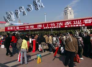 3日下午在口岸廣場和暖的陽光下,兩地書法家們對著一條拼成近20米長的長桌大筆潑墨,一幅幅飽蘸金粉的春聯(lián)將春節(jié)漸近的氣氛襯托得無比濃烈。為方便旅客,每個書法家面前都備有一份包括數(shù)百幅春聯(lián)的數(shù)據(jù),索要者選中任何一幅,書法家立即現(xiàn)場揮毫題寫,使索要者立即可取。