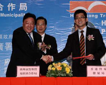 為攜手構(gòu)建現(xiàn)代服務(wù)業(yè)體系,廣州市外經(jīng)貿(mào)局與香港貿(mào)易發(fā)展局于發(fā)布會(huì)上,簽署了《穗港現(xiàn)代服務(wù)業(yè)合作備忘錄》,宣告穗港兩地政府將開拓合作新思維,推進(jìn)現(xiàn)代服務(wù)業(yè)互利共贏。從今年起,穗港兩地政府將建立服務(wù)業(yè)合作年會(huì)制度和聯(lián)絡(luò)員制度,并重點(diǎn)在金融業(yè)、會(huì)展業(yè)、物流業(yè)、服務(wù)外包四大重點(diǎn)領(lǐng)域推進(jìn)全面合作。