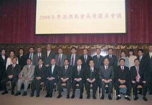 “2008年粵港澳商會(huì)高層圓桌會(huì)議”由香港中華總商會(huì)副會(huì)長(zhǎng)林銘森主持。在會(huì)議上發(fā)言的還有:香港中華總商會(huì)會(huì)長(zhǎng)霍震寰、廣東省總商會(huì)會(huì)長(zhǎng)陳丹、香港工業(yè)總會(huì)主席陳鎮(zhèn)仁等。