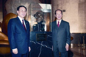圖:何鴻燊陪同馮國(guó)勤參觀馬首銅像。(圖片來(lái)源:澳門日?qǐng)?bào))