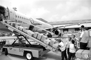 五月十八日,澳門救助四川地震災(zāi)民的首批救災(zāi)物資在澳門國際機場裝倉啟運。由澳門紅十字會及澳門街坊總會認(rèn)購的這批救災(zāi)物資包括奶粉、毛毯、食品、電筒等災(zāi)區(qū)急需的物資共十二噸。這些物資由澳門航空公司免費運送,將于當(dāng)日下午抵達(dá)成都雙流國際機場。 中新社發(fā) 史利 攝