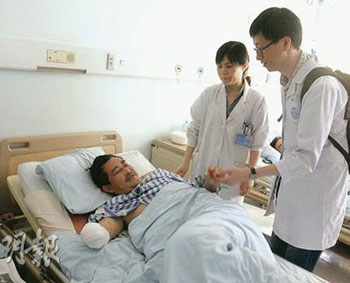 臥在病床上的賈大夫,破爛的腸臟已縫補好,情況穩(wěn)定過來,但因雙臂和盆骨都折斷,動也不能動,深切體會能醫(yī)不自醫(yī)的無奈。他坦言,若不是身受創(chuàng)傷,他應(yīng)是在災(zāi)場上救援的一員,但目前只能等待由香港到來的醫(yī)生為他動手術(shù)!罢娴暮芨兄x香港醫(yī)生愿意前來幫忙……很有心……”