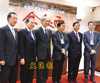 香港浸會大學“馮漢柱基金全人教育教授”正式任命余秋雨(右三)為奠基教授。校長吳清輝(右二)和浸大全人教與學中心總監(jiān)陳載灃(右一)等合照。(圖片來源:文匯報)