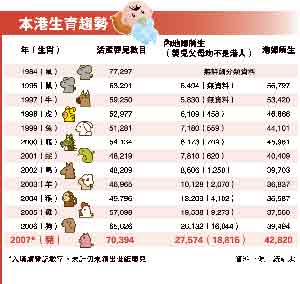 據(jù)香港明報報道,2007年醫(yī)管局共錄得39,182名新生嬰數(shù)字,醫(yī)管局總行政經(jīng)理鄭信恩說,雖然傳統(tǒng)上生仔旺季一向在9月至11月,但今年首個半月公立醫(yī)院生產(chǎn)個案,已明顯較去年同期上升,“去年經(jīng)濟好,市民積極想生育多點,估計今年生育也會多,新生嬰應(yīng)會超過去年!