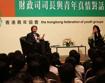 曾俊華在見面會(huì)開始之初就明確表示,歡迎學(xué)生發(fā)問任何問題,鼓勵(lì)他們切勿過分緊張!澳銈冇腥魏蜗敕,或者你們知道親戚朋友有什么看法,都盡管提出來。如果你們覺得預(yù)算案是稍為沉悶的話,你們可以提出其它比較有趣的話題!