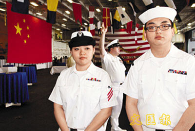 除了消費(fèi),也有華裔船員對(duì)于能夠看到五月二日的奧運(yùn)圣火傳遞表示興奮。出生地在上海的朱瑩,是“小鷹號(hào)”上為數(shù)不多的華裔船員之一,加入“小鷹號(hào)”兩年,目前在船上主要從事機(jī)械工程工作。奧運(yùn)圣火傳遞當(dāng)日,正好是她的輪休日!白约鹤鳛橹袊(guó)人,一定會(huì)去看圣火傳遞。中國(guó)奧運(yùn),我們都是中國(guó)人,一定會(huì)去捧場(chǎng)!”“因?yàn)槲沂侵袊?guó)人!”