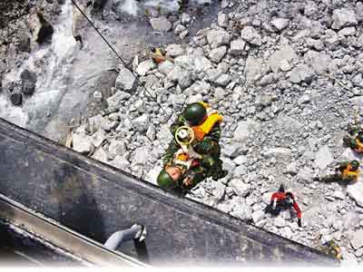 31日早上11時(shí)17分,一架編號(hào)為B-4125的直升機(jī)載著中尉彭兵等6名空降兵前去營救。他們帶著兩天的干糧和水,從直升機(jī)索降到一塊狹小地帶,開始搜尋受傷礦工。歷經(jīng)4個(gè)多小時(shí)搜尋,終于找到兩名受傷礦工,對(duì)他們進(jìn)行了消毒和簡(jiǎn)單包扎,并用擔(dān)架將他們抬到幾千米外直升機(jī)能夠營救的地點(diǎn)。