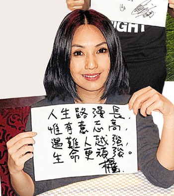 經(jīng)歷一年的恢復(fù),千嬅贊賞政府重建災(zāi)區(qū)的速度很快,像曾受災(zāi)的北川或會再有余震,現(xiàn)移往新地方重建了另一個北川,好讓民眾重新開展新生活,自給自足。千嬅明白這不是一時三刻可以完全復(fù)元過來,重建項(xiàng)目尚要很多年才能真正成功。但令千嬅最欣慰的是:“去年到災(zāi)區(qū)時,城里每個人臉上都是鎖緊愁眉,這次重臨舊地,就看到連小朋友都變得開懷了,臉上有掛上笑容,問他們的志愿,大家異口同聲說想做醫(yī)生將來去幫人,所看到的都是充滿生存的意志,這也就是中國人的特質(zhì),擁有頑強(qiáng)的生命力和團(tuán)結(jié)一致的精神!”