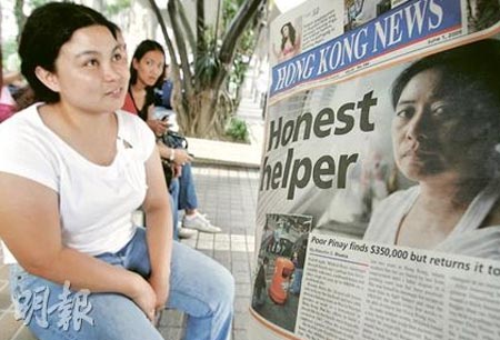 據(jù)香港《明報(bào)》報(bào)道,離鄉(xiāng)別井為兩餐,從菲律賓來港謀生的女傭Mildred Perez,不甘雇主對她做出的不法行為,訴諸法院,在候?qū)徠陂g不能另找工作,只靠拾荒維生,每天掙約38元生活費(fèi)。有一天,她意外地得到一個可擺脫貧困的機(jī)會——在垃圾堆中拾獲35萬元巨款,但她把錢全數(shù)退還失主,雖然換來的只是一盒曲奇餅作答謝,但她并無后悔,繼續(xù)其撿破爛的日子。