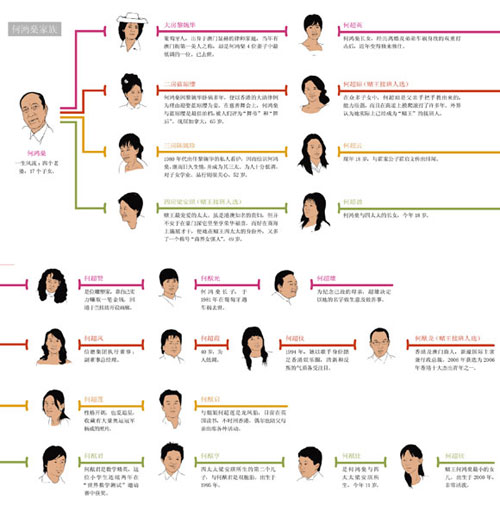 作為澳門(mén)首富,“賭王”何鴻燊及其家族控制著高達(dá)5000億港元的資產(chǎn);同時(shí),作為富人明星,何鴻燊不但被港澳坊間稱為“何大口”(對(duì)媒體說(shuō)話百無(wú)禁忌),其四位太太所生的17個(gè)子女,更一直是各大報(bào)紙雜志商業(yè)、時(shí)政和娛樂(lè)版多年來(lái)的風(fēng)頭人物。