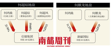 何鴻燊旗下的商業(yè)王國(guó)中,以信德集團(tuán)最為實(shí)業(yè)化,經(jīng)營(yíng)房地產(chǎn)、酒店及運(yùn)輸?shù)葮I(yè)務(wù),由二太太長(zhǎng)女何超瓊?cè)味驴偨?jīng)理,二太太三個(gè)女兒也占股權(quán)共37%,是名副其實(shí)的大股東;二太太長(zhǎng)子何猷龍擔(dān)任董事長(zhǎng)的新濠國(guó)際,何鴻燊所占股份也低于兒子。