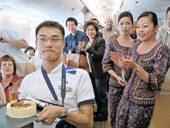 根據(jù)新加坡航空資料,約有10多名港人成為A380首航的見(jiàn)證人,當(dāng)中包括獨(dú)自登上航機(jī)的年輕人Francis Wu。昨日度過(guò)22歲生辰的Francis,正忙于以手提電腦輸入日志時(shí),機(jī)組人員神秘地捧蛋糕走近,為他慶祝。其它乘客亦加入慶祝行列,一同拍掌唱生日歌,空姐亦特別送上生日卡,難怪Francis說(shuō):“今次是他人生中最好的一個(gè)生日!痹诿绹(guó)舊金山City College修讀計(jì)算機(jī)科技的Francis表示,數(shù)月前父母問(wèn)他今年希望收到什么生日禮物時(shí),他說(shuō)希望可乘坐A380的首航,于是父母以1250美元(約9750港元)為他投得機(jī)票。