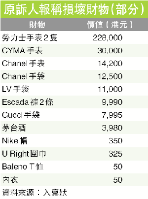 唐仔細羅列37項受損財物,其中以衣物為主,包括價值50元的內(nèi)衣及成衣品牌Baleno出品的T恤;另外的名貴財物包括接近4000元的茅臺酒、勞力士、Chanel及CYMA等4只名表,所有財品總值36.6萬元。此外,唐的一塊載有婚宴來賓簽字的紅布,以及數(shù)項衣物亦損壞,但價值有待確定。