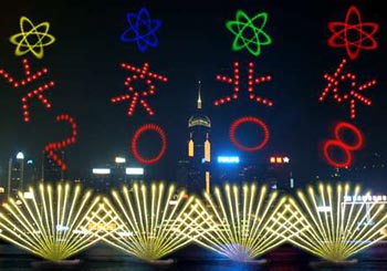 另外,展開序幕的是市民耳熟能詳?shù)馁R歲歌曲《財(cái)神到》,配合一個(gè)接一個(gè)在空中出現(xiàn)的“8”圖案,寓意國家富強(qiáng),人民生活富足,“一國兩制”成功落實(shí),祖國及香港欣然面對(duì)無限的發(fā)展機(jī)遇。