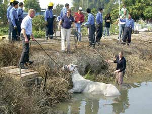 消防接報趕至,欲合10多人之力拉馬上水,但白馬大驚掙扎不肯上岸,馬場職員唯有不斷喂紅蘿卜安慰馬兒情緒。