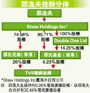 目前邵逸夫透過(guò)邵氏兄弟(上市公司)、邵氏基金及個(gè)人直接持有,合共持有電視廣播32.49%股權(quán)。若有買家對(duì)電視廣播有興趣,可向邵氏直接購(gòu)入電視廣播股權(quán),或收購(gòu)市值較低的邵氏兄弟,達(dá)至以較低成本間接控制電視廣播。