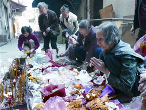 大興街附近的石敢當(dāng),門外設(shè)置多個(gè)售賣祭品攤位。有攤販表示,多年來生意并無太大變動(dòng),可見“打小人”習(xí)俗并沒有因?yàn)樯鐣?huì)的進(jìn)步而被遺忘,間中仍可見年輕女子加入“打小人”行列。