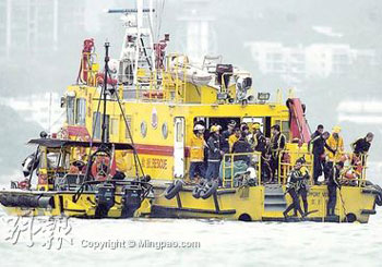 撞船意外后,香港多個(gè)部門連續(xù)兩晚通宵搜救,10艘水警輪、6艘海事處船舶、5艘消防船和5架飛行服務(wù)隊(duì)直升機(jī)先后參與救援,但一直未有失蹤者音信。消防處表示,23日每次派出一組兩人的蛙人,9度潛入海底搜索,且曾經(jīng)接近船身,以直接敲打方式測(cè)試有否生命跡象,可惜絲毫沒有反應(yīng),蛙人也未能進(jìn)入船艙。