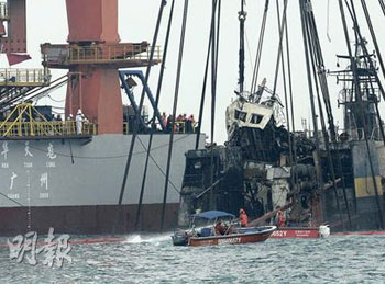 另有消息傳出廣州打撈局人員在晚上8時(shí)進(jìn)行打撈工序期間,在沉船拖纜機(jī)左右兩邊先發(fā)現(xiàn)2具尸體,其后在船艙再發(fā)現(xiàn)2具尸體,但由于暫時(shí)不適合搜救,所以港方搜救人員暫未將尸體撈起。