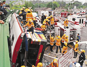 中新網(wǎng)5月6日電 據(jù)香港文匯報報道,上周四(5月1日)在香港西貢南邊圍回旋處釀成18死44傷的旅游巴翻側(cè)大車禍,一名于北區(qū)醫(yī)院留醫(yī)的45歲女傷者,經(jīng)5天搶救后延至5日終告?zhèn)夭恢,令大車禍死者增?9人。