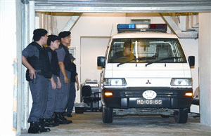 圖:囚車準備駛離初院,獄警在場戒備。(圖片來源:澳門日報)
