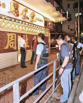 大隊(duì)香港警員趕至,穿上避彈衣,荷槍實(shí)彈兜截仍沒有結(jié)果。被劫金行為周生生金行,開設(shè)在大埔道近北河街交界處地下,營業(yè)時(shí)間由上午10時(shí)至下午7時(shí)半。