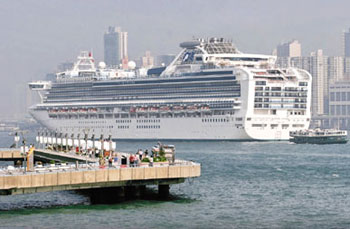 排水量超過11萬噸的鉆石公主號郵輪,14日載著逾3000名船員及旅客抵港。由于船只體積太大,不能靠近海運碼頭,只能在西環(huán)對外海面停泊,旅客要乘接駁船只,乘船到中環(huán)港外線碼頭上岸。旅發(fā)局特別派出職員在碼頭接待,在碼頭設(shè)置咨詢及服務(wù)專柜,向旅客派發(fā)歡迎禮包。