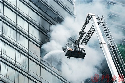 消防員接報(bào)到場(chǎng)時(shí),起火樓層火勢(shì)異常猛烈,兩落地玻璃抵受不住熱力爆裂,碎片橫飛,火舌四射。消防員即進(jìn)入火場(chǎng)射水灌救,搜索被困工人,并升起云梯向起火房間的外部射水灌救。