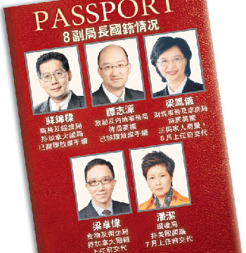 29日,除了已外游的候任運輸及房屋局副局長邱誠武,各副局長都已回復(fù)傳媒查詢。候任財經(jīng)事務(wù)及庫務(wù)局副局長梁鳳儀、候任環(huán)境局副局長潘潔、候任食物及衛(wèi)生局副局長梁卓偉3人仍未決定如何處理外國國籍或居留權(quán)。