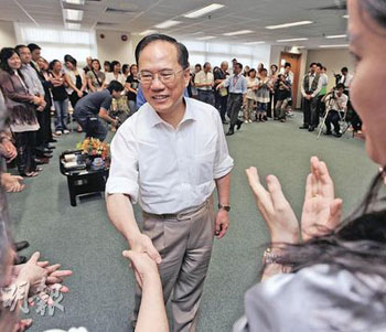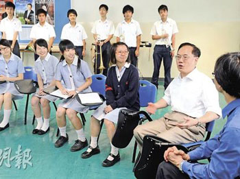 曾蔭權(quán)(右)與家長及學(xué)生就教育問題交換意見。(圖片來源:明報(bào))