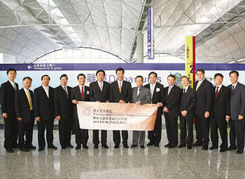 圖為港專聯(lián)臺灣訪問團(tuán)離港時,中華旅行社總經(jīng)理?xiàng)罴因E(左6)及遠(yuǎn)東貿(mào)易服務(wù)中心主任嚴(yán)重光(左8)到機(jī)場送行。(圖片來源:文匯報)