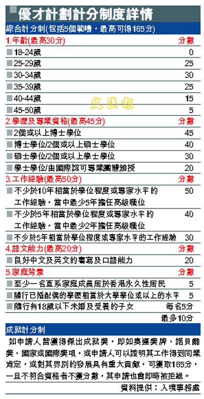 香港入境處在六月二十八日公布優(yōu)才計(jì)劃的計(jì)分方法并即日接受申請。符合“基本資格”所有條件的申請人,可選擇以“綜合計(jì)分制”或“成就計(jì)分制”接受進(jìn)一步評(píng)核。每名申請人只能在同一時(shí)間提交一份申請,并只能在同一次申請中選擇以一種計(jì)分制進(jìn)行評(píng)核!