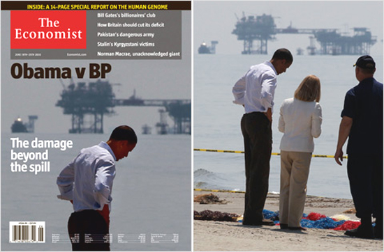 《經濟學人》的這張封面照讓美國民眾極為憤怒。原來,這張圖片被編輯做了刻意的修改,利用Photoshop去掉了兩個人——站在奧巴馬右側的拉福什縣縣長夏洛特·蘭道夫(Charlotte Randolph)(中)和美國海岸警衛(wèi)隊司令薩德·艾倫(Thad Allen)。而這樣做的目的就是營造出“孤獨”的氣氛。