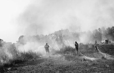 波塔波夫的話很快得到了驗證。就在記者返回途中,距莫斯科大約15公里處,路邊一個加油站附近起火。這個加油站南側(cè)有一道大約10米寬的隔離帶,再往外則是一個比足球場還大的草場,草場的東、西、南三面是森林。記者看到,100多米長的火龍借著風(fēng)力向加油站方向翻滾而來。過火之處,留下黑乎乎的灰燼。加油站的職工用提水桶和臉盆盛著水往草場飛奔。