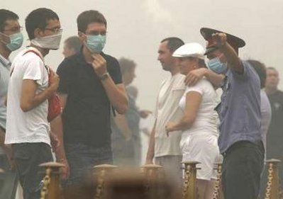 根據(jù)環(huán)保單位的檢測(cè),莫斯科空氣污染的程度,已經(jīng)超出正常值三倍,氣象預(yù)測(cè)說(shuō)這個(gè)禮拜狀況應(yīng)該會(huì)改善。嚴(yán)重的霾害,也影響航空交通,星期天,因?yàn)槟芤?jiàn)度太差,莫斯科各機(jī)場(chǎng)總共有九十多架航班延誤或是停飛。