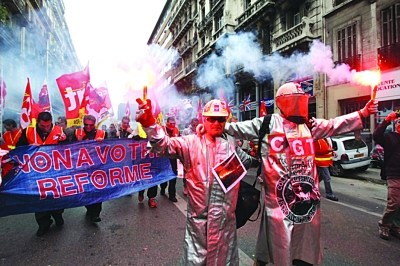 由于法國(guó)總統(tǒng)薩科齊執(zhí)意進(jìn)行養(yǎng)老金改革,即準(zhǔn)備將最低退休年齡由60歲延長(zhǎng)至62歲,領(lǐng)取全額政府退休金的年齡則從65歲提高至67歲。這讓法國(guó)工會(huì)組織十分不滿。為了逼迫政府讓步,連日來,他們發(fā)動(dòng)了數(shù)次罷工和示威游行。截至當(dāng)?shù)貢r(shí)間16日,罷工潮已席卷法國(guó)大多數(shù)地區(qū)。