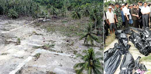 海底強(qiáng)震引起的致命海嘯發(fā)生兩天后,傷亡人數(shù)持續(xù)增加。最靠近震中、受創(chuàng)最深的明打威島煉,救難人員之前由于氣候惡劣無(wú)法登陸,裝載16噸的帳篷、藥品、食物和衣物的貨機(jī),總算于27日下午抵達(dá)。由于挖墓的人力不足,仍可見(jiàn)到遺體散布在海邊及路邊。