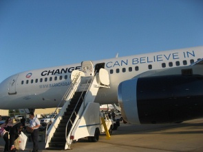 奧巴馬的競選專機是由一架波音757客機改裝而成的,整個機艙共分為三個部分,其中機頭部分是奧巴馬、他的家人以及高級助手們專用的豪華客艙,其后是專機機組人員專用休息艙,再后面則是商務(wù)客艙,接近機尾部分是專門為隨機采訪的媒體人士而設(shè)的經(jīng)濟客艙。奧巴馬選擇這架波音757客機作為專機后,對它進行了較大幅度的改裝,他們將專機涂上了藍白色相間的顏色,機身兩邊寫著奧巴馬的其競選口號--“我們可以相信的改變”。其中引起強烈爭議的部分,則是奧巴馬將客機尾翼上的美國星條旗抹除掉,而噴上帶有太陽初升的奧巴馬獨特標志。這架專機改裝完成后,立即載著奧巴馬競選陣營的工作人員和媒體人士飛行中東,奧巴馬21日更是乘坐這架競選專機飛抵伊拉克,并與伊拉克官員以及駐伊美軍高級將領(lǐng)會面。