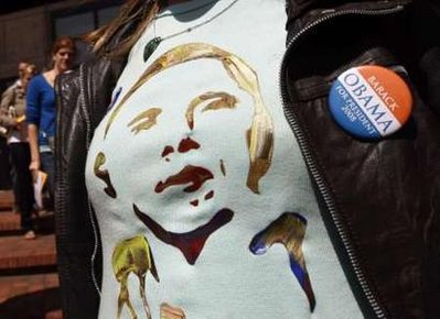 10月8日,一名居住在阿根廷的美國選民身著印有奧巴馬頭像的T恤。