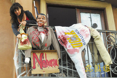 警方發(fā)言人覆述兩名學(xué)生稱,因在媒體上看到有人在加州寓所外問吊共和黨副總統(tǒng)候選人佩林的人像,才模仿行為,把戴上奧巴馬萬圣節(jié)面具、穿西裝褸和長內(nèi)褲的人像吊到樹上。