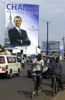 肯尼亞基蘇木市街頭,印有奧巴馬頭像的巨大廣告牌。