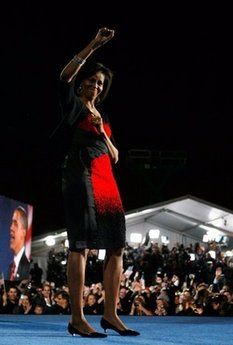 米歇爾協(xié)助丈夫拉票期間,最喜歡穿著的其中一款服飾是稱身的緊身裙,在奧巴馬宣布贏得民主黨總統(tǒng)候選人提名資格的場合,米歇爾便穿了一襲由芝加哥設(shè)計師Maria Pinto設(shè)計的紫色緊身裙;出席民主國全國代表大會時,則挑選了一套出自同一設(shè)計師手筆的藍綠色V領(lǐng)連身裙。