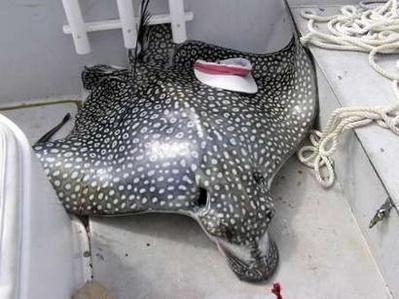 斑點黃貂魚能夠長到200多公斤,翼展能夠長到3米左右,它們偶爾會躍出水面但是攻擊性并不強,也會用它們尾部堅硬的毒鉤進行防御。