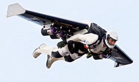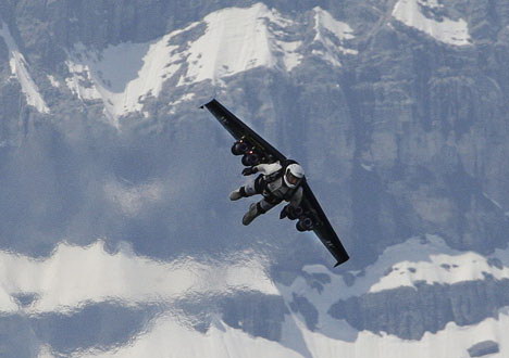 前瑞士戰(zhàn)斗機(jī)飛行員羅西花了五年的時(shí)間來(lái)建造和完善動(dòng)力翼套裝,他昨天穿著這套動(dòng)力翼套裝跳離了一架小型飛機(jī)。當(dāng)他從2250米的飛機(jī)上跳下時(shí),他展開(kāi)了長(zhǎng)達(dá)3米的動(dòng)力翼,動(dòng)力翼被綁在他的身后。當(dāng)從自由落體狀態(tài)轉(zhuǎn)為滑行狀態(tài)后,他啟動(dòng)了四個(gè)發(fā)動(dòng)機(jī),這使他的飛行速度加速至每小時(shí)304公里。他在爬升至780米后再次向地面俯沖,在身后留下一串特效煙霧。
