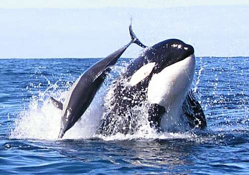 他說(shuō):“更令人吃驚的是,他們跟海豚嬉戲,教小鯨獵殺本領(lǐng)。成年鯨與海豚一齊躍出水面,教小鯨如何獵殺!