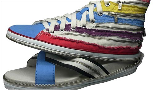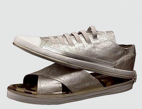 這種多變鞋被稱為Nat-2,它看上去就象一雙普通的匡威牌帆布鞋。但如果你想讓腳透氣,只需解開拉鏈,這時呈現(xiàn)在你面前的就是一雙涼鞋了。帆布鞋的上部能夠很容易地折疊起來,放進包里。目前有20種不同的樣式可供選擇,人們可以根據(jù)自身喜好選擇不同的款式進行搭配。該創(chuàng)意很可能來自于20世紀(jì)80年代的動畫片變形金剛。然而與這些到處都能買到的塑料機器人不同的是,人們很難找到出售Nat-2鞋子的商店。目前,在英國唯一取得該鞋子經(jīng)營權(quán)的是位于倫敦西南部亭克漢姆(Twickenham)的 Wild Goose。每雙鞋子的售價為59.99英鎊。