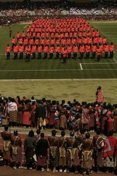 這場適逢國王40歲生日兼建國40年的“雙40”典禮,節(jié)目包括6萬佳麗的御前獻(xiàn)舞、打鼓表演、閱兵巡禮,以及在王太后御苑舉行的“花園派對”等。連同特別為今次活動購入、用來接載國王等嘉賓的20輛豪華車、南非訂制的大蛋糕和宰殺120頭牛。