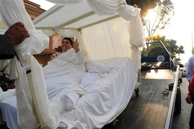 烏里韋腿上裹著白色床單,躺在特制的大床上,被載往婚禮地點(diǎn)。